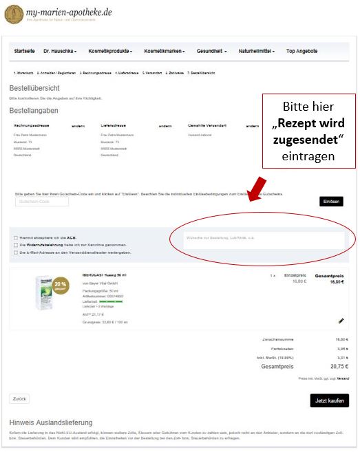 Sie wählen wie gewohnt Ihre rezeptfreien Artikel aus und legen diese in den Warenkorb. Damit ersichtlich ist, dass Sie noch ein Rezept einreichen, füllen Sie bitte im Warenkorb als Pflichtangabe das Kommentar-Feld aus mit „Rezept sende ich zu.“ Nach Ihrer Bestellbestätigung warten wir auf die Zusendung des Rezepts. Sobald dieses eingegangen ist, erhalten Sie von uns die Vorkasse-Aufforderung bzw. versenden wir Ihre komplette Bestellung. Bitte beachten Sie: Sollten wir bis 7 Tage nach Bestellung kein Rezept von Ihnen erhalten haben, versenden wir die Bestellung der rezepfreien Produkte automatisch.