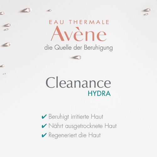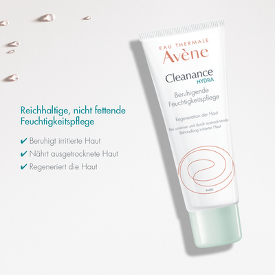 Die Cleanance HYDRA Beruhigende Feuchtigkeitspflege mit 50 % hautberuhigendem, reizlindernden und entzündungshemmenden Avène Thermalwasser enthält außerdem Glycoleol, das reich an essenziellen Fettsäuren ist und die schützende Hautbarriere wiederherstellt. Darüber hinaus mindert Dextransulfat Irritationen und Rötungen, die durch eine austrocknende Behandlung entstanden sind.