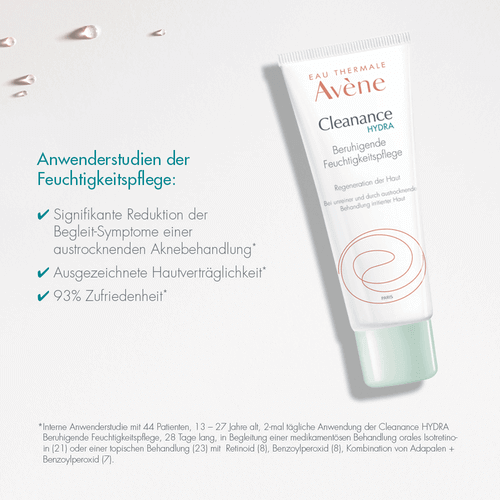 Die Cleanance HYDRA Beruhigende Feuchtigkeitspflege hat feuchtigkeitsspendende und regenerierende Eigenschaften und wirkt somit gegen die hautreizenden Effekte medizinischer Aknebehandlungen.