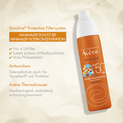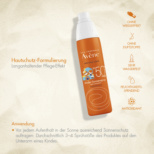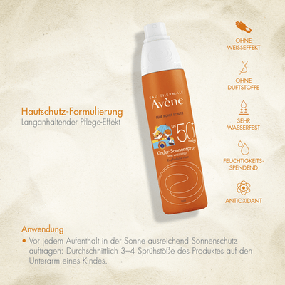 Dieses nicht fettende Sonnenspray bietet der empfindlichen Haut von Kindern sicheren Schutz vor intensiver Sonneneinstrahlung. Hervorragend verträglich und mit hautberuhigendem Avène Thermalwasser. Sonnenschutz für Kinder - ohne Duftstoffe.