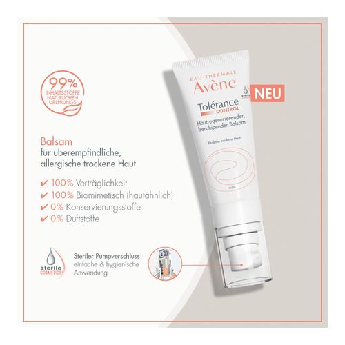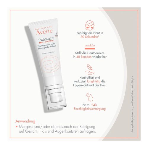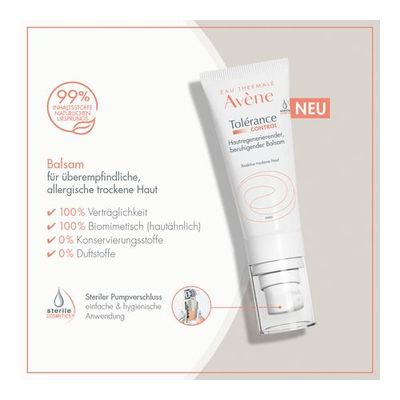 Der hochverträgliche Eau Thermale Avène Tolérance Control Balsam spendet empfindlicher trockener bis sehr trockener Haut Feuchtigkeit im Gesicht, Hals und Augenkonturen und wirkt zusätzlich ultra-beruhigend.