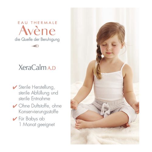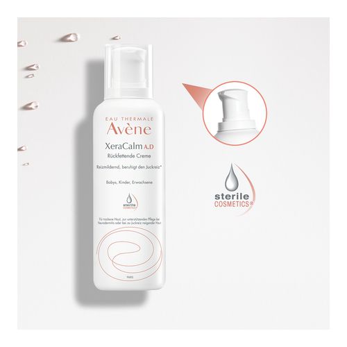 Die Avène XeraCalm A.D Creme zeichnet sich durch ihren sterilen Pumpspender aus, der eine einfache Dosierung und hygienische Entnahme ermöglicht und für eine hohe Verträglichkeit sorgt. Die hochverträgliche Gesichts- und Körperpflege ist bereits für Babys ab 1 Monat geeignet. Die Creme wird steril hergestellt sowie abgefüllt und ist ohne Duft- und Konservierungsstoffe. Besonders ist die Creme bei trockener Haut, atopischen Hautzuständen, zu Neurodermitis neigender Haut oder Altersxerose geeignet.