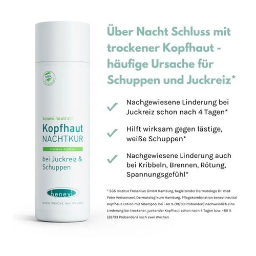Die BENEVI Nachtkur ist eine gezielte Feuchtigkeitspflege für die trockene, juckende und schuppende Kopfhaut.