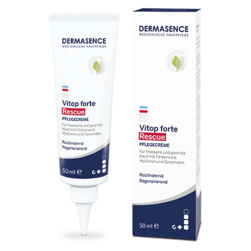 Die DERMASENCE Vitop forte Rescue Pflegecreme wurde speziell für sehr trockene und gereizte Haut entwickelt. Mit dem bewährten Vitop-Komplex kann die Pflegecreme Entzündungsprozessen vorbeugen. Sie spendet intensive Feuchtigkeit durch Hyaluronsäure und Glycerin, hautverwandte Lipide stärken die Hautbarriere. Die Creme hilft akuten Trockenheitsphasen vorzubeugen und ist in der praktischen Tube immer zur Hand, wenn die Haut es braucht.
