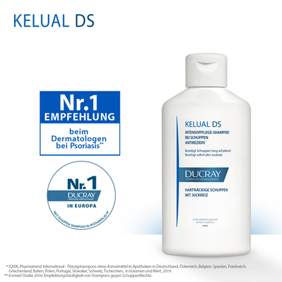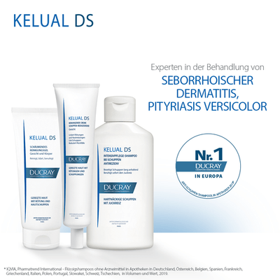 DUCRAY KELUAL DS Shampoo wurde speziell entwickelt, um unangenehmen Hautausschlägen und Ekzemen im Bereich der Kopfhaut entgegenzuwirken. Sind diese Ekzeme mit Schuppungen oder einem Hefepilzbefall verbunden, ist KELUAL DS Shampoo Ihre ideale Begleitpflege. Die Nr. 1 Empfehlung beim Dermatologen bei seborrhoischer Dermatitis hat eine schnelle und nachhaltige Wirkung. Der Duft des Shampoos ist dezent und Hypoallergen. Das Haar wird durch das Shampoo geschützt, gepflegt und ist optimal kämmbar. Die einmal wöchentliche Anwendung nach einer abgeschlossenen Schuppen-Behandlung mit DUCRAY KELUAL DS beugt wirksam einer erneuten Schuppenbildung vor.
