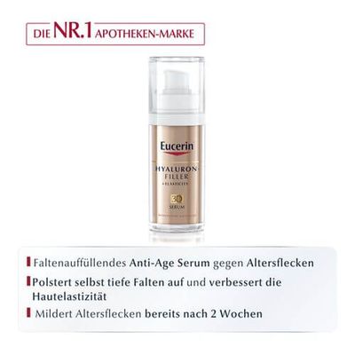 Das Eucerin Hyaluron-Filler + Elasticity 3D Serum mildert Altersflecken sowie Pigmentflecken und behandelt die 3 Dimensionen der Hautalterung effektiv. Es eignet sich als ein Anti-Aging Serum für reife Haut und kann bei regelmäßiger Anwendung Altersflecken effektiv mildern und deren Neuentstehung vorbeugen. Zudem werden selbst tiefe Falten aufgepolstert und die Hautelastizität verbessert. Das Hautbild wirkt so ebenmäßiger und straffer. Die innovative Formel wirkt mit Thiamidol® und es sind bereits nach 2 Wochen sichtbare Ergebnisse in der Minderung von Altersflecken erkennbar.