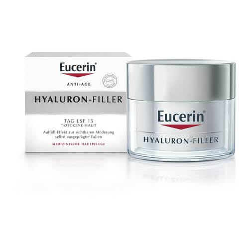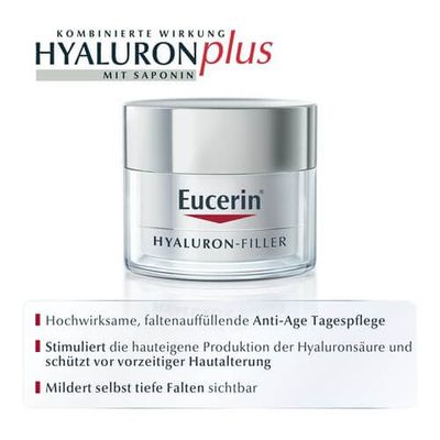 Erstmals hat Eucerin® hochkonzentriertes Saponin in eine kosmetische Formel eingearbeitet. Saponin redynamisiert tiefenwirksam die Produktion hauteigener Hyaluronsäure, so dass das Bindegewebe auf natürliche Weise wieder aufgepolstert wird. Selbst tiefe Falten werden von innen aufgefüllt und dadurch sichtbar gemildert. Als zweiten aktiven Wirkstoff enthält die Creme reine Hyaluronsäure. Dadurch werden die obersten Hautschichten sofort mit Hyaluronsäure versorgt, und es kommt zu einer sofort sichtbaren Glättung der Trockenheitsfältchen.