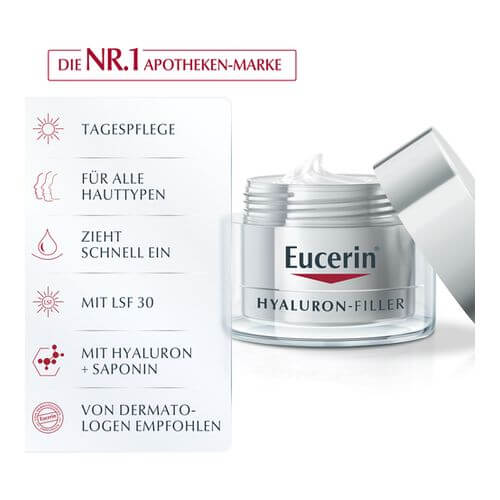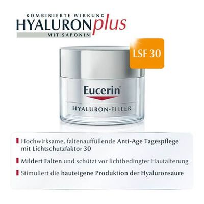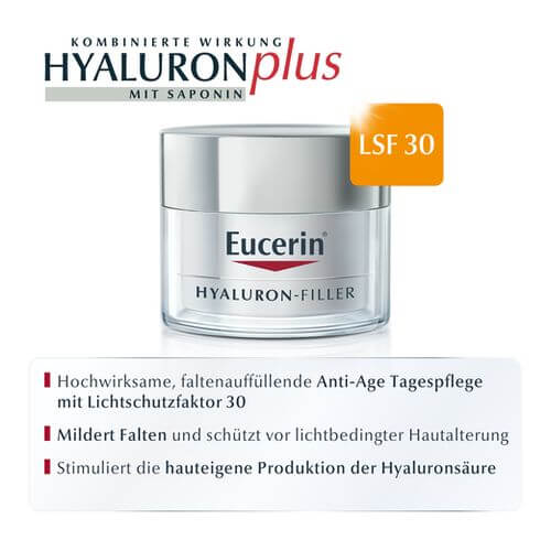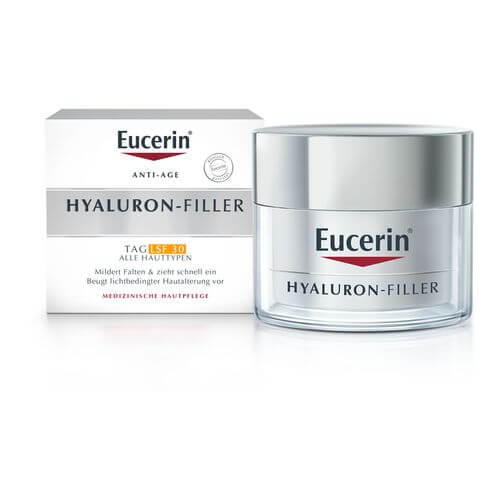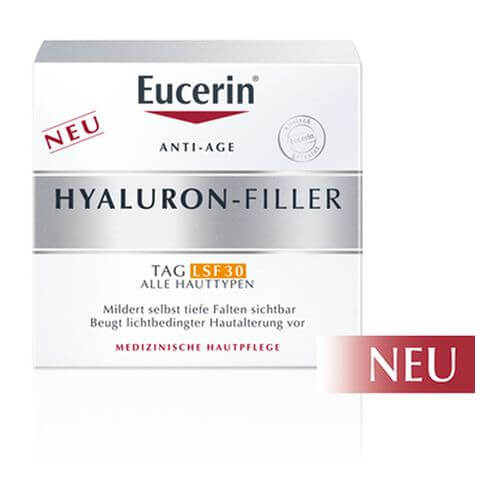 Die Eucerin HYALURON-FILLER Tagespflege LSF 30 ist für alle Hauttypen geeignet und wirkt gegen die ersten Anzeichen der Hautalterung an. Sie polstert erste Fältchen sowie selbst tiefe Falten von innen heraus auf – für ein verjüngtes Aussehen. Die Tagescreme kombiniert langkettige Hyaluronsäure mit im Vergleich hierzu 40-mal kleinerer, kurzkettiger Hyaluronsäure und reduziert somit selbst ausgeprägte Falten sichtbar.