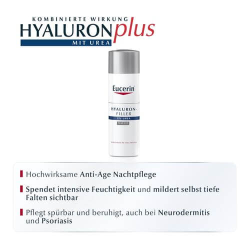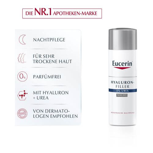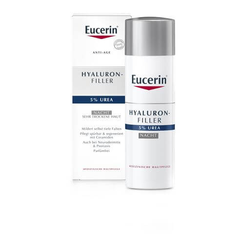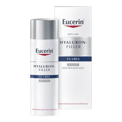 Die Eucerin Hyaluron-Filler Urea Nachtpflege wirkt Falten entgegen, die durch Austrocknen der Haut entstehen. Die einzigartige Kombination von 5% Urea mit lang- und kurzkettiger Hyaluronsäure spendet intensive Feuchtigkeit und mildert selbst tiefe Falten sichtbar. Die schnell einziehende Textur beruhigt auch problematische Haut und verleiht ein geschmeidiges Hautgefühl. Die Formel mit Ceramiden regeneriert die Haut in der Nacht.