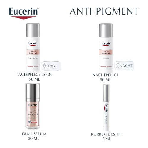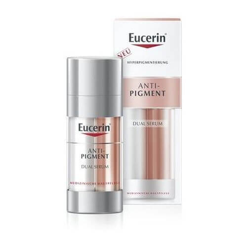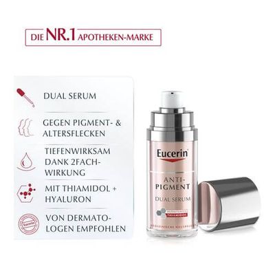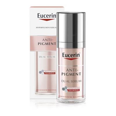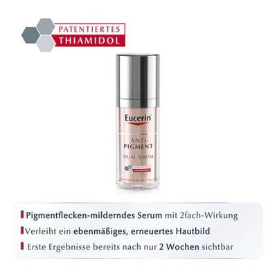 Das Eucerin Anti-Pigment Dual Serum mit dem Einkammer-Spender wirkt mit patentiertem Thiamidol®, das Pigmentflecken und sogenannte Altersflecken am Ursprung bekämpft, diese nach und nach mildert sowie bei regelmäßiger Anwendung verhindert, dass neue Pigmentflecken entstehen. Zusätzlich enthält die Gesichtspflege  Hyaluronsäure, die der Haut intensive Feuchtigkeit spendet. Beide Texturen sind leicht und ziehen schnell ein – für ein strahlenderes Aussehen und einen ebenmäßigeren Hautton.
