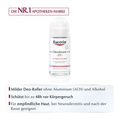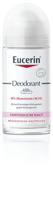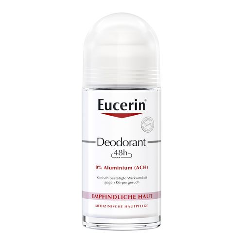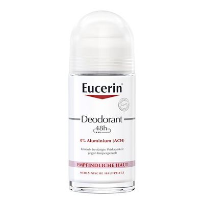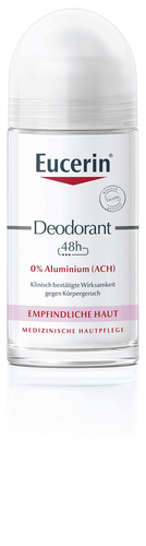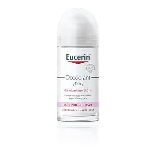Eucerin Deodorant Roll-on Empfindliche Haut 48 h 0% Aluminium enthält weder Aluminium (ACH) noch Alkohol oder Parabene. Es wird selbst von sehr empfindlicher Haut (auch bei Neurodermitis) vertragen. Es ist so mild, dass es auch nach der Rasur oder Epilation sofort aufgetragen werden kann. Das aluminiumfreie Deo brennt nicht, verursacht keine Hautirritationen und schützt nachweislich mindestens 48 Stunden vor Körpergeruch. Gleichzeitig verstärkt der dezent-frische und unisexe Duft das Frischegefühl.