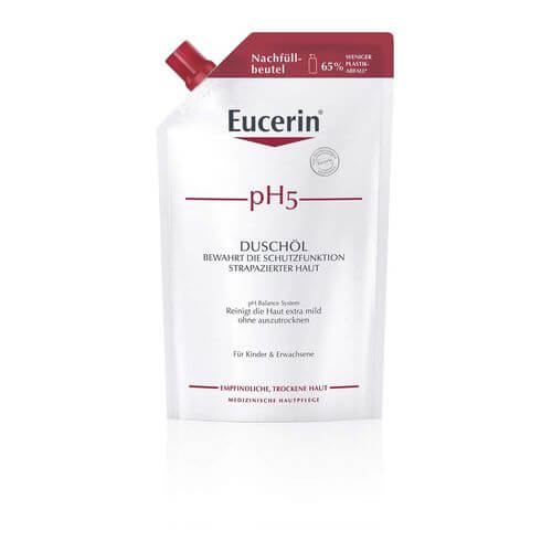 Bewahrt die Schutzfunktion strapazierter Haut. Eine milde Körperreinigung, die die natürliche Schutzfunktion der Haut bewahrt und selbst bei häufigem Waschen die Haut vor dem Austrocknen schützt. Für Kinder ab 3 Jahren und Erwachsene. Eucerin pH5 Duschöl wurde speziell mit extra milden Tensiden zur Reinigung trockener, empfindlicher Haut entwickelt. Die Formel mit dem natürlichen pH-Wert und Dexpanthenol bewahrt nachweislich die natürliche Schutzfunktion und Widerstandskraft der Haut und reinigt sanft mit einem hohen Anteil natürlicher Pflegeöle. Das Duschöl ist unparfümiert und auch für Kinder ab 3 Jahren geeignet.