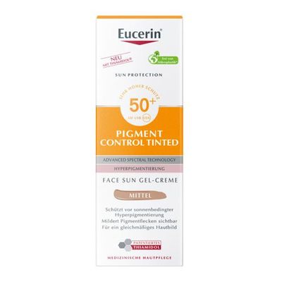 Eucerin Pigment Control Tinted Face Sun Gel-Creme LSF50+ Mittel ist eine getönte Sonnencreme, die einen gleichmäßigen Teint verleiht und vor sonnenbedingten Pigmentflecken schützt. Die Formel enthält Thiamidol, einen effektiven und patentierten Pflegewirkstoff, der auf den Ursprung der Melaninproduktion einwirkt. Er sorgt für das Verblassen von Pigmentflecken bei regelmäßiger Anwendung, bis sich der Hautton insgesamt verbessert. Die Creme ist für die tägliche Anwendung geeignet.