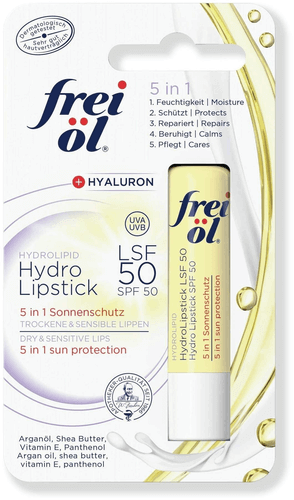 Der frei öl® HYDROLIPID HydroLipstick LSF 50 - die 5 in 1 Hyaluron-Lippenpflege mit Sonnenschutz pflegt die Lippen und spendet Feuchtigkeit. Dank der Kombination der UVA/UVB-Lichtschutzfilter und hohem LSF 50 werden sensible Lippen optimal geschützt. Die Textur verleiht einen leichten Glanz und ein angenehmes Hautgefühl. Enthält einen sichtbaren pflegenden Kern aus Hyaluronsäure und Panthenol (Dexpanthenol).