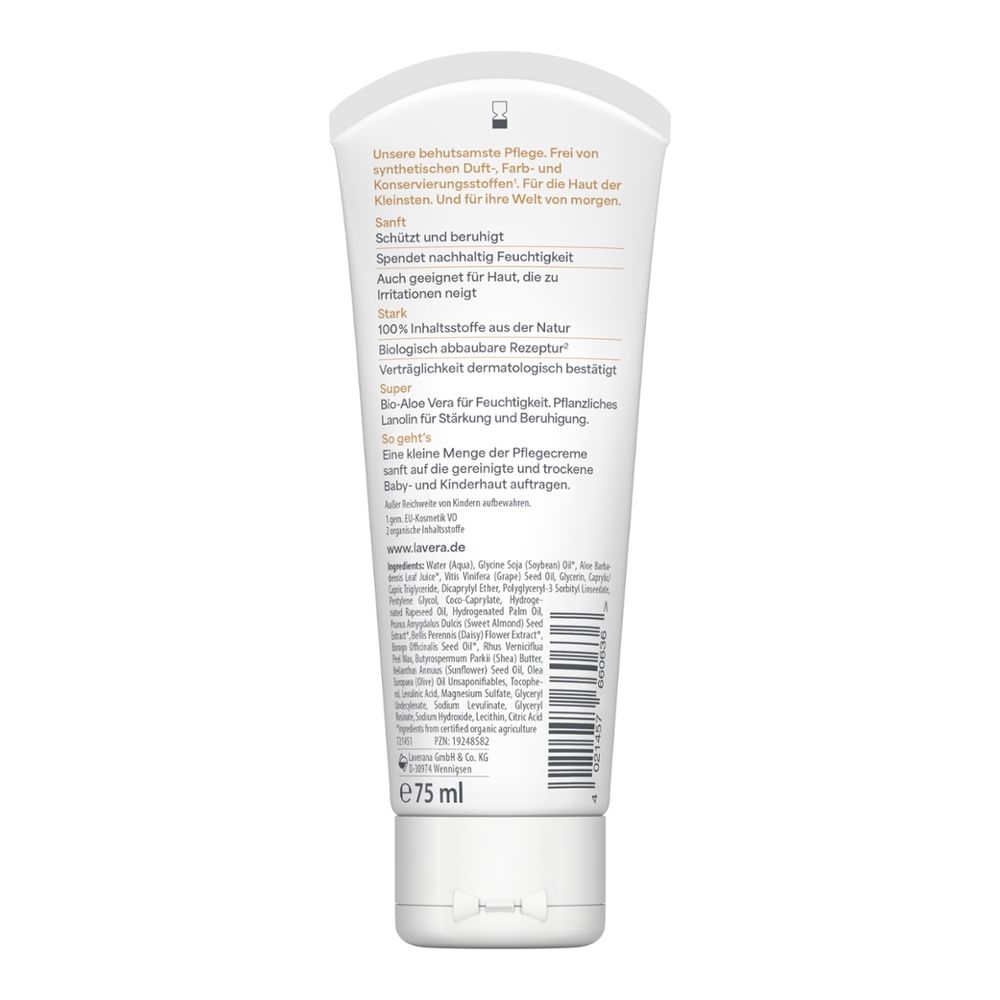 Die behutsam formulierte Pflegecreme aus der lavera Baby & Kinder Serie stärkt die natürliche Schutzfunktion der Haut und spendet ihr nachhaltend Feuchtigkeit. Mit Bio-Aloe Vera und pflanzlichem Lanolin. Ohne synthetische Duft-, Farb- und Konservierungsstoffe1. Sanft, beruhigend und besonders verträglich.