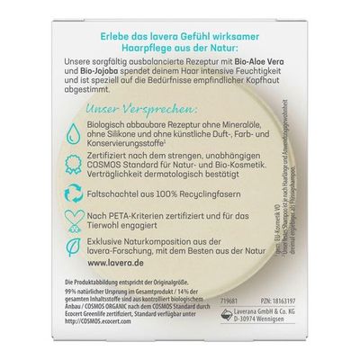 Die sorgfältig ausbalancierte Rezeptur mit Bio-Aloe Vera und Bio-Jojoba spendet deinem Haar intensive Feuchtigkeit und ist speziell auf die Bedürfnisse empfindlicher Kopfhaut abgestimmt. Das feste Shampoo ist je nach Haarlänge und Anwendungsgewohnheit dreimal ergiebiger als Flüssigshampoo.