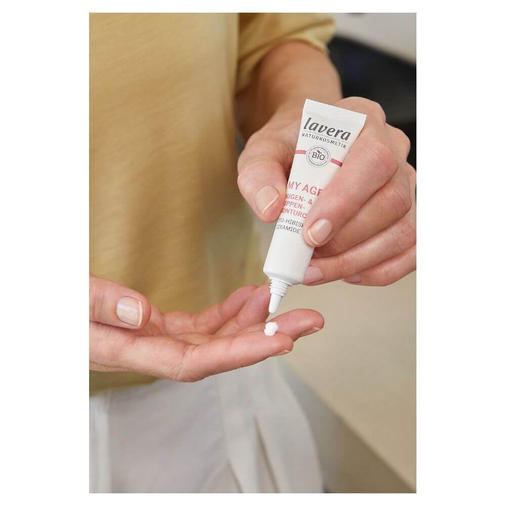 Erlebe das lavera Gefühl natürlich wertvoller Gesichtspflege für reife Haut: Unsere MY AGE Augen- & Lippenkonturcreme mit Bio-Hibiskus und Ceramiden pflanzlichen Ursprungs mindert Mimikfalten um die Augen und verleiht den Lippenkonturen mehr Spannkraft. Spüre wie die geschmeidige Textur die empfindliche Augenpartie besonders intensiv pflegt.