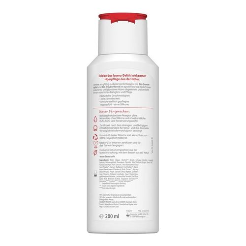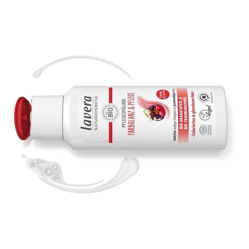 Die sorgfältig ausbalancierte Rezeptur mit Bio-Granatapfel und Bio-Traubenkernöl ist speziell auf die Bedürfnisse colorierter und glanzloser Haare abgestimmt und verleiht ihnen natürlichen Farbglanz und Pflege.