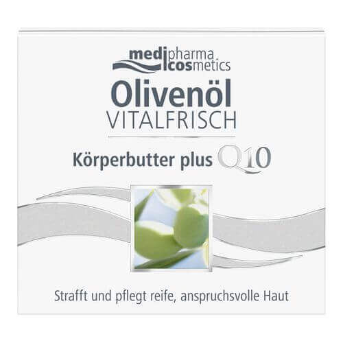 Olivenöl Vitalfrisch Körperbutter enthält eine Kombination aus kaltgepresstem Olivenöl aus der Toskana, Olivenblattextrakt, reinem Q 10 und wertvollem Vitamin E - sie unterstützt die Regeneration der Haut. Shea Butter und Cupuacu Butter schützen und pflegen die Haut zusätzlich vor dem Austrocknen. Verwöhnen und pflegen Sie Ihren Körper täglich mit der reichhaltigen Olivenöl Vitalfrisch Körperbutter und genießen Sie samtweiche, straffere Haut. Anti-Falten Körperpflege Creme mit Shea Butter und Cupuacu-Butter, pflegt und schützt, für samtweiche und straffe Haut. ausgewählte Inhaltsstoffe wie kaltgepresstes Olivenöl, Olivenblattextrakt, reines Coenzym Q10 und zusatzliches Vitamin E unterstützen die Hautgeneration und verwöhnen mit Feuchtigkeit und Pflege für reife, anspruchsvolle Haut schützt die Haut vor vorzeitiger Alterung durch Umwelteinflüsse. Spendet reichhaltig Feuchtigkeit und bietet Schutz vor dem Austrocknen. Verwöhnen Sie Ihren Körper mit Olivenöl Pflege von medipharma cosmetics
