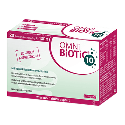 Während der gesamten Antibiotika-Therapie 2 x täglich 1 Beutel OMNi-BiOTiC® 10 (= 5 g) in 1/8 l Wasser einrühren, mindestens 10 Minuten Aktivierungszeit abwarten, nochmals umrühren und dann trinken.