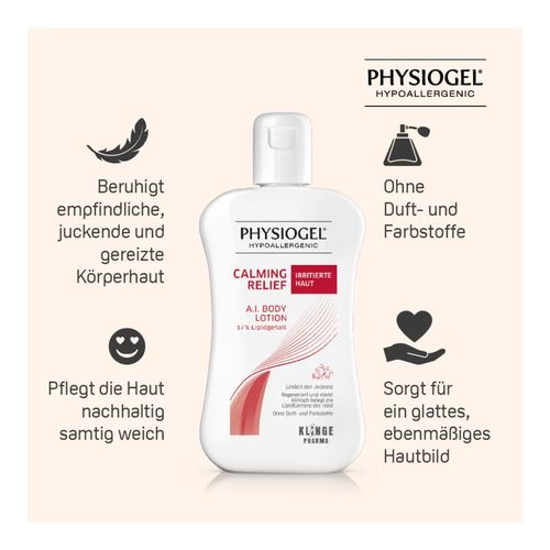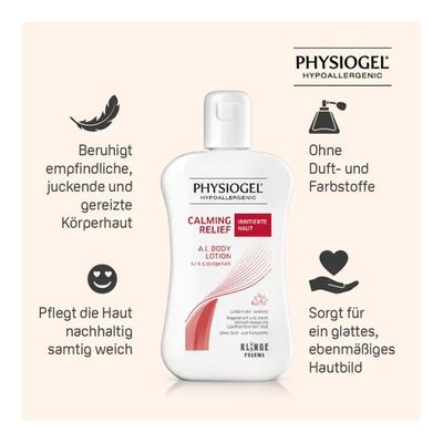 Die PHYSIOGEL® Calming Relief A.I. Body Lotion ist eine leichte Lotion, welche für irritierte oder juckende Haut entwickelt wurde. Durch einen hautberuhigenden Wirkkomplex aus hautverwandten Lipiden und Palmitoylethanolamin (PEA) lindert die PHYSIOGEL® Calming Relief A.I. Body Lotion Juckreiz und Rötungen, zudem wird die Haut natürlich und sanft gepflegt.