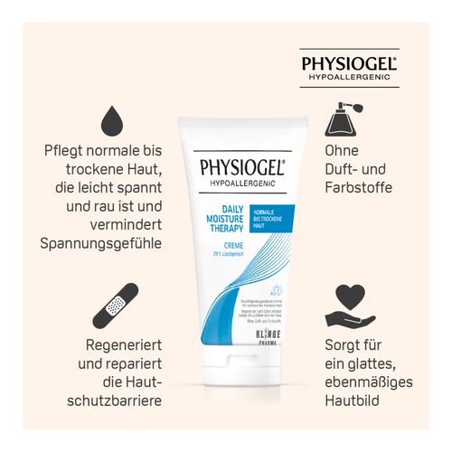 Die PHYSIOGEL® Daily Moisture Therapy Creme für normale bis trockene Haut pflegt mit dem 3-fach Effekt für die tägliche Anwendung: feuchtigkeitsspendend, regeneriert und repariert.