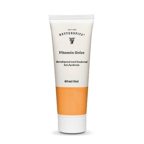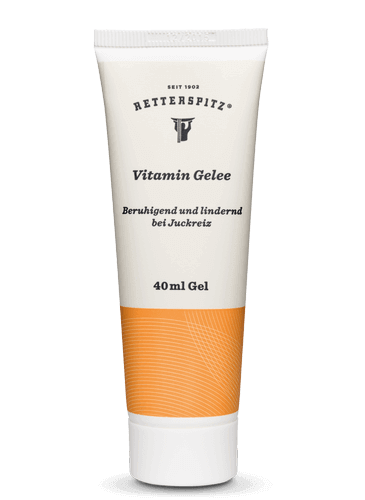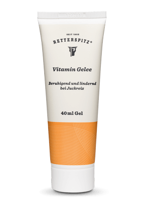 Manchmal muss es etwas anderes sein als die übliche Pflege. Wenn die Haut juckt, spannt oder trocken ist, können Cremes und Lotionen die sensiblen Stellen zusätzlich reizen. Retterspitz Vitamin Gelee beruhigt, kühlt und pflegt, wenn sich die Haut in einem Ausnahmezustand befindet, wie zum Beispiel bei Mückenstichen. Vitamin E bindet freie Radikale und regeneriert die Schutzbarriere in der Haut. Gleichzeitig regelt es den Feuchtigkeitshaushalt. Gestresste, angegriffene und trockene Haut kann sich so schneller erholen. Die Inhaltsstoffe Allantoin und Thymol lindern Entzündungen und eignen sich auch besonders für strapazierte Haut, die juckt.