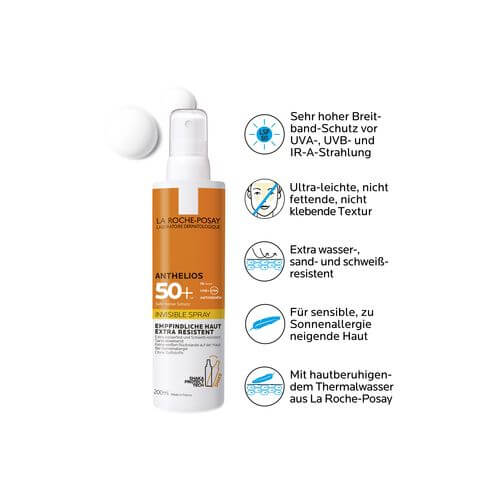 Das Anthelios Invisible Spray ohne Parfum LSF 50+ schützt die Haut langanhaltend vor UVA-, UVB- und IR-A-Strahlung. Es bietet einen umfassenden Schutz für empfindliche und zu Sonnenallergie neigende Haut. Gleichzeitig ist die Formel des Sprays ultra-leicht und hinterlässt keine weißen Streifen auf der Haut. Es ist extra wasser-, sand- und schweißfest. Dank Netlock Technologie läuft es nicht in die Augen und reizt sie nicht. Glycerin schenkt der Haut intensiv Feuchtigkeit, sodass sie nicht austrock