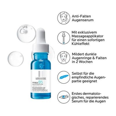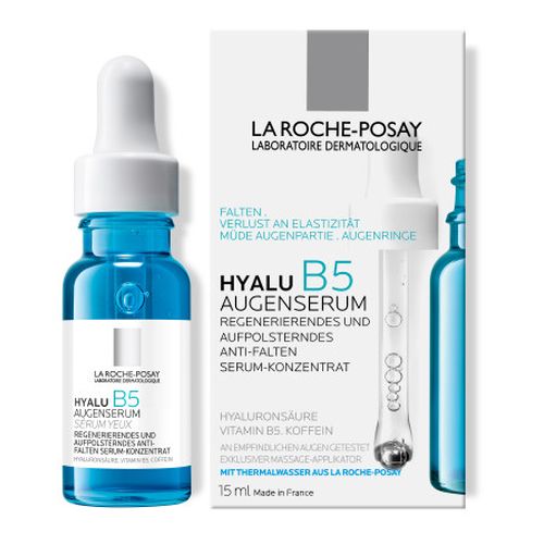 Das Roche-Posay Hyalu B5 Augenserum polstert dank kurz- und langkettiger Hyaluronsäure Falten sofort auf und wirkt dem Verlust der Spannkraft entgegen. Enthält pflegendes Vitamin B5, welches den Regenerationsprozess der Haut verbessert und die natürliche Hautschutzbarriere stärkt. Der Anti-Augenringe Wirkstoffkomplex mildert Augenringe und die Augenpartie erscheint revitalisiert und straffer. Mit exklusivem Massage-Applikator für wirksames Abschwellen. Das parfümfreie Augenserum mit beruhigendem Thermalwasser spendet der Augenpartie intensive Feuchtigkeit.