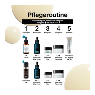 1. Morgens: Bei Anwendung am Morgen zuerst gründlich das Gesicht reinigen und ein SkinCeuticals Vitamin-C-Serum auftragen und einwirken lassen. Dann 4-6 Tropfen des A.G.E. Interrupter Ultra Serums auf die gereinigten Fingerspitzen geben und sanft auf Stirn, Wangen, Kinn und Hals auftragen. Nach kurzer Einwirkzeit die Gesichtspartien mit einer SkinCeuticals Feuchtigkeitscreme und/oder einem Sonnenschutz eincremen. 2. Abends: Nach der Gesichtsreinigung eine Pipette des A.G.E. Interrupter Ultra Serums sanft auf die betreffenden Gesichtspartien auftragen.