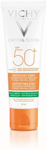 Die CAPITAL SOLEIL 3-IN-1 MATTIERENDE SONNENPFLEGE LSF 50+ von Vichy ist eine Sonnencreme mit Anti-Glanz-Effekt für das Gesicht. Sie überzeugt mit einem 3-in-1 Effekt: absorbierend, mattierend und schützend. Die Formel mit Tonerde absorbiert überschüssige Fette und wirkt mattierend. Zusätzlich schützen das Vulkanische Wasser aus Vichy und ein probiotischer Extrakt gegen Anzeichen von fettiger Haut und stärken die Hautbarriere. Dank des Anti-Glanz-Effektes und hohen Sonnenschutzes dient die Sonnenpflege auch als eine perfekte Ergänzung zur Tagespflege.