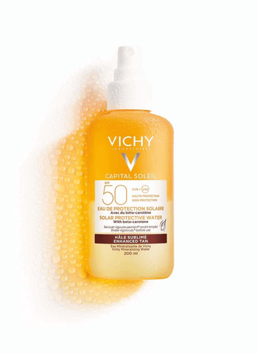 Das Vichy CAPITAL SOLEIL BRÄUNUNGSINTENSIVIERENDE SONNENSPRAY LSF 50 von Vichy kombiniert einen hohen Breitbandschutz mit einem besseren Bräunungsgrad der Haut. Die leichte Formel der Sonnenpflege von Vichy enthält Beta-Carotin, das für einen ebenmäßigeren Teint sorgt. Dazu bewahrt der Lichtschutzfaktor 50 Körper und Gesicht vor UVA- und UVB-Strahlen. Die wässrige Textur hinterlässt keine weißen Rückstände auf der Haut. Außerdem ist das transparente Sonnenspray auch für empfindliche Hau