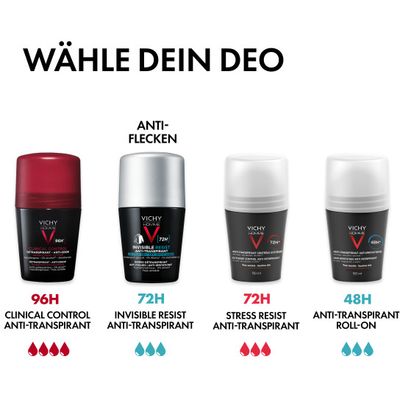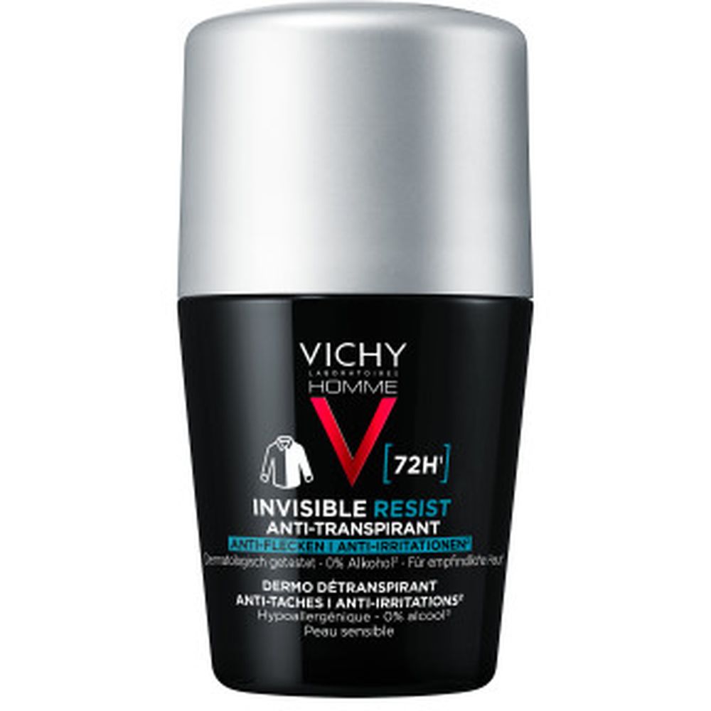 Anders als herkömmliche Deos sorgt der Vichy Homme Deo Roll-on 72h AT Invisible bis zu 72 Stunden lang für eine gehemmte Schweißbildung und hinterlässt dank seiner Anti-Flecken-Formel keine gelblichen und weißen Rückstände auf Textilien. Durch den hypoallergenen Wirkstoffkomplex und die alkoholfreie Formulierung, ist das Deodorant besonders hautfreundlich und somit für empfindliche Männerhaut geeignet.