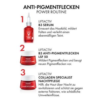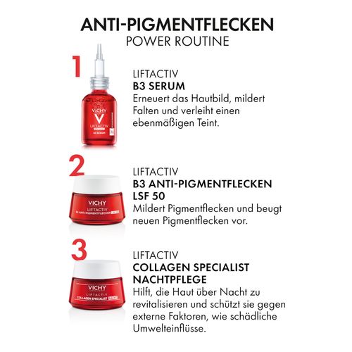 Die Vichy Tagescreme mit Lichtschutz schützt die Haut vor den Auswirkungen von UVA- und UVB-Strahlen. Vichy LIFTACTIV B3 Anti-Pigmentflecken Creme LSF 50 zeichnet sich durch ihre zweifache Wirksamkeit aus: Sie mildert Pigmentflecken und beugt ihnen vor. Anti-Pigmentflecken Tagescreme mit Lichtschutz. Die Creme mit Niacinamid mildert die Anzeichen von Pigmentflecken in der basalen Hautschicht und LSF 50 schützt vor Hyperpigmentierung, indem er UVA- und UVB-Schäden in der Haut vorbeugt.