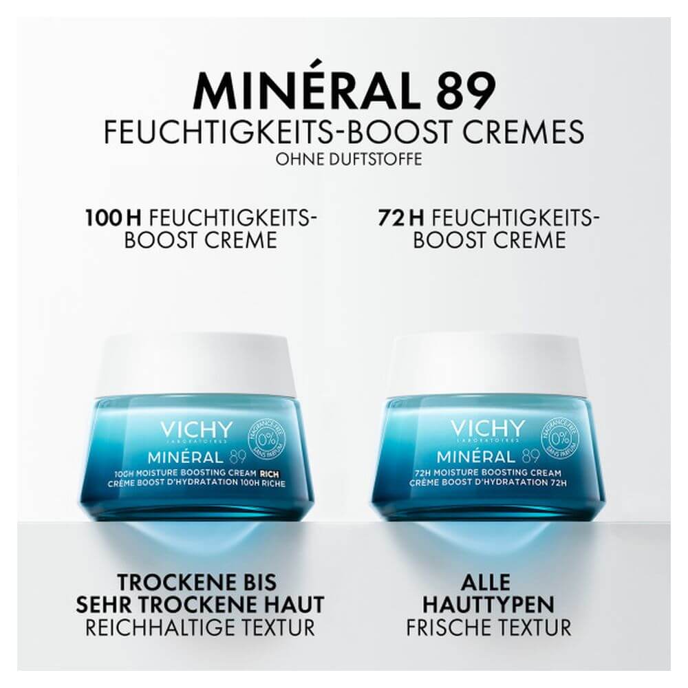 Die feuchtigkeitsspendende VICHY MINERAL 89 Creme reichhaltig ohne Duftstoffe  täglich morgens und abends als letzten Schritt der täglichen Pflegeroutine anwenden. Dafür die Feuchtigkeitscreme auf das gereinigte Gesicht sowie auf Hals und Dekolleté auftragen und mit den Fingerspitzen vorsichtig einmassieren. Die samtig-weiche, reichhaltige Textur zieht schnell ein und hinterlässt ein intensiv-gepflegtes Hautgefühl. In Kombination mit der Anwendung des MINÉRAL 89 Hyaluron-Boost von Vichy wirkt die MINÉRAL 89 Creme noch effektiver, sodass die Haut optimal mit wertvoller Feuchtigkeit versorgt wird.