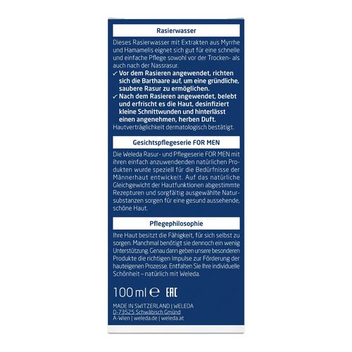 Weleda Rasierwasser ist als Pre- und After-Shave für die Trocken- und Nassrasur geeignet. Vor dem Rasieren angewendet, richten sich die Barthaare auf, was eine saubere Rasur erleichtert. Nach dem Rasieren erfrischt und belebt Weleda Rasierwasser die Haut. Es duftet angenehm herb und desinfiziert kleine Schnittwunden. Ein Auszug aus Myrrhe wirkt adstringierend und Hamamelis tonisiert die Haut.