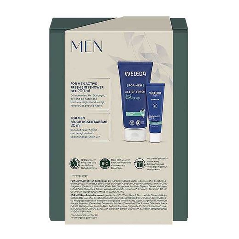 Die idealen Begleiter in einem Set, für einen frischen Start in den Tag: Das FOR MEN Active Fresh 3in1 Shower Gel mit holzig-aromatischem, aktivierendem Duft reinigt Körper, Gesicht und Haare. Die FOR MEN Feuchtigkeitscreme spendet Feuchtigkeit, besänftigt die Haut und beugt Spannungsgefühlen vor. Das perfekte Geschenk – auch für dich selbst!
