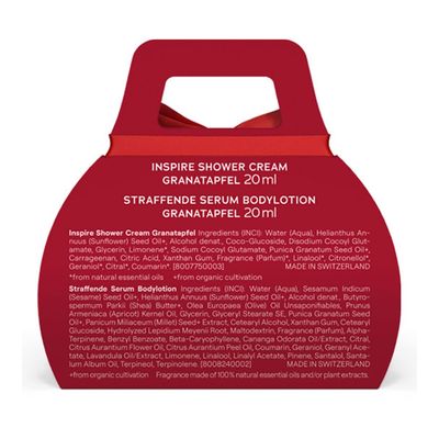 Straffende Körpercreme: Water (Aqua), Sesamum Indicum (Sesame) Seed Oil, Alcohol, Helianthus Annuus (Sunflower) Seed Oil, Butyrospermum Parkii (Shea) Butter, Prunus Armeniaca (Apricot) Kernel Oil, Olea Europaea (Olive) Oil Unsaponifiables, Glycerin, Glyceryl Stearate SE, Fragrance (Parfum)*, Punica Granatum Seed Oil, Panicum Miliaceum (Millet) Seed Extract, Cetearyl Alcohol, Cetearyl Glucoside, Xanthan Gum, Limonene*, Linalool*, Benzyl Benzoate*, Geraniol*, Citral*, Coumarin*. *from natural essential oils and/or plant extracts